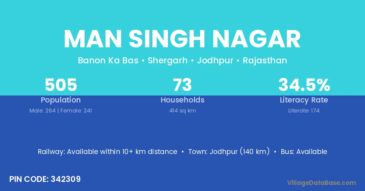 Jodhpur (140 km) is the nearest town to Man Singh Nagar village for major economic activities and is located approximately 140 km away.