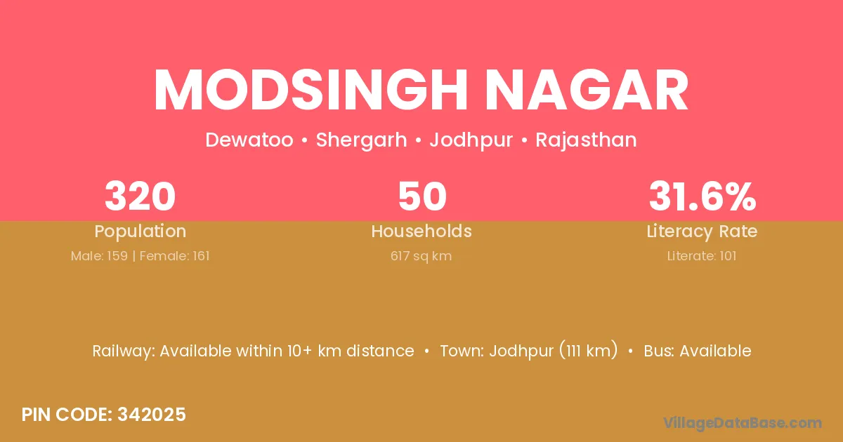 Jodhpur (111 km) is the nearest town to Modsingh Nagar village for major economic activities and is located approximately 111 km away.