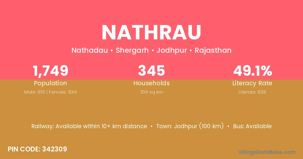 Jodhpur (100 km) is the nearest town to Nathrau village for major economic activities and is located approximately 100 km away.