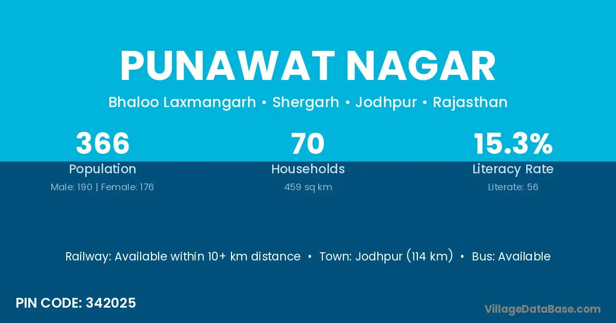 Jodhpur (114 km) is the nearest town to Punawat Nagar village for major economic activities and is located approximately 114 km away.