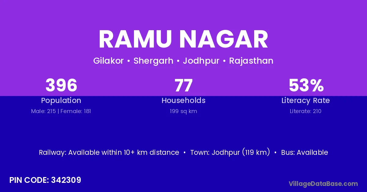Jodhpur (119 km) is the nearest town to Ramu Nagar village for major economic activities and is located approximately 119 km away.