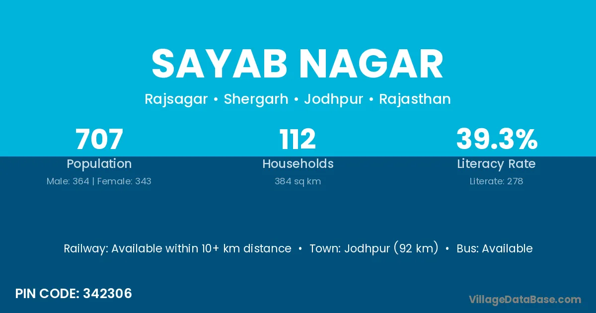 Jodhpur (92 km) is the nearest town to Sayab Nagar village for major economic activities and is located approximately 92 km away.