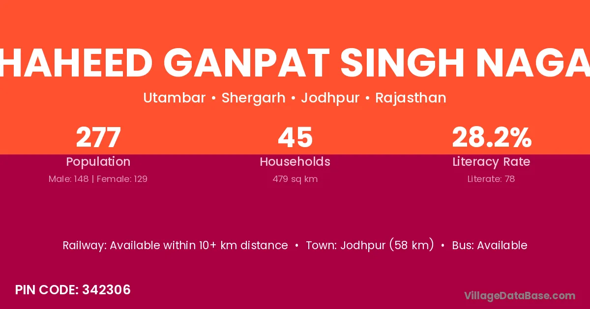 Jodhpur (58 km) is the nearest town to Shaheed Ganpat Singh Nagar village for major economic activities and is located approximately 58 km away.