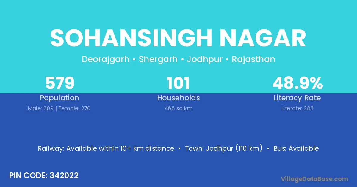 Jodhpur (110 km) is the nearest town to Sohansingh Nagar village for major economic activities and is located approximately 110 km away.