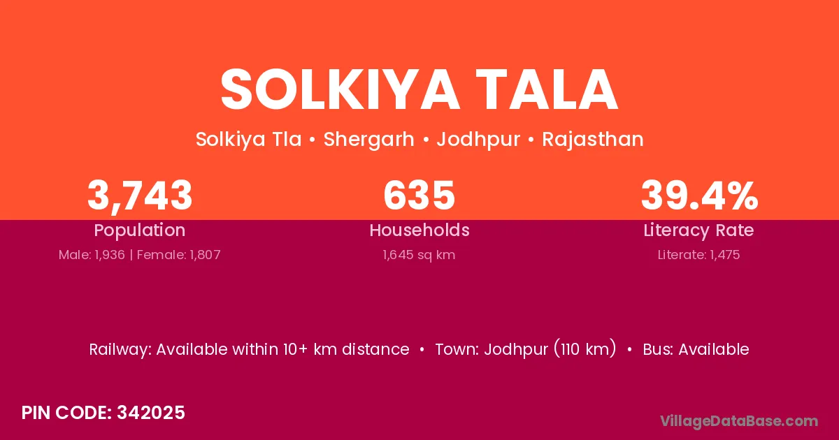 Jodhpur (110 km) is the nearest town to Solkiya Tala village for major economic activities and is located approximately 110 km away.