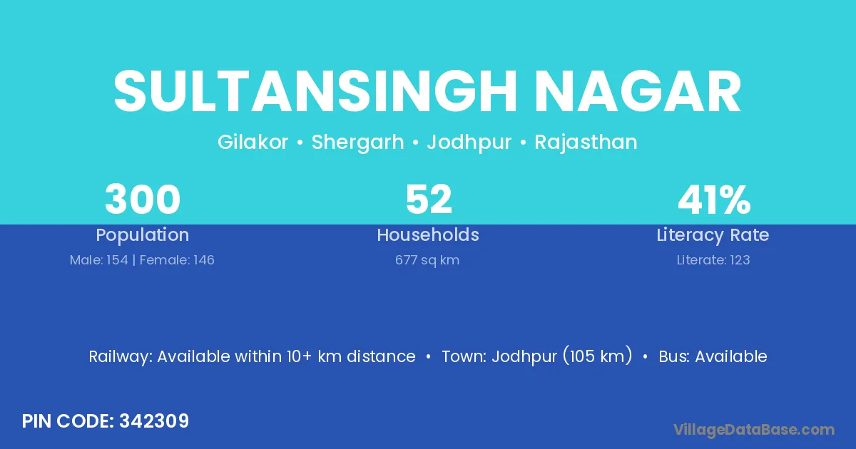 Jodhpur (105 km) is the nearest town to Sultansingh Nagar village for major economic activities and is located approximately 105 km away.