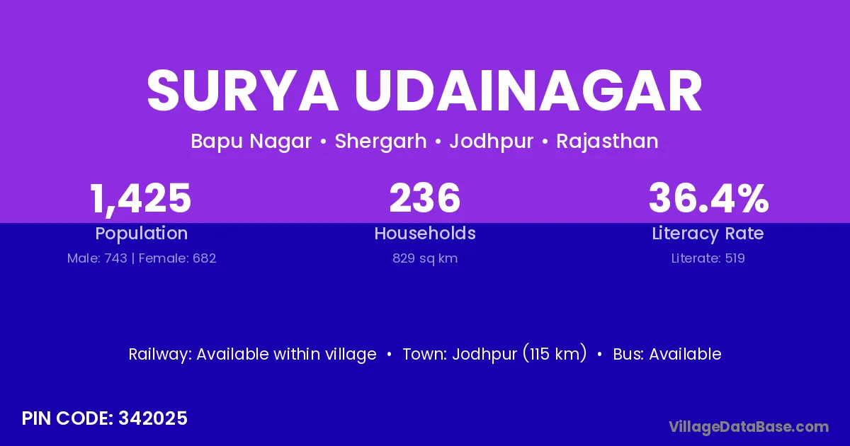 Jodhpur (115 km) is the nearest town to Surya Udainagar village for major economic activities and is located approximately 115 km away.