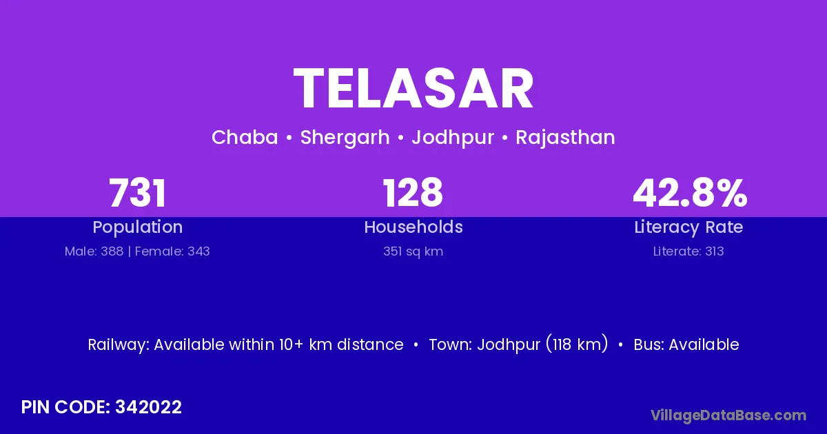 Jodhpur (118 km) is the nearest town to Telasar village for major economic activities and is located approximately 118 km away.