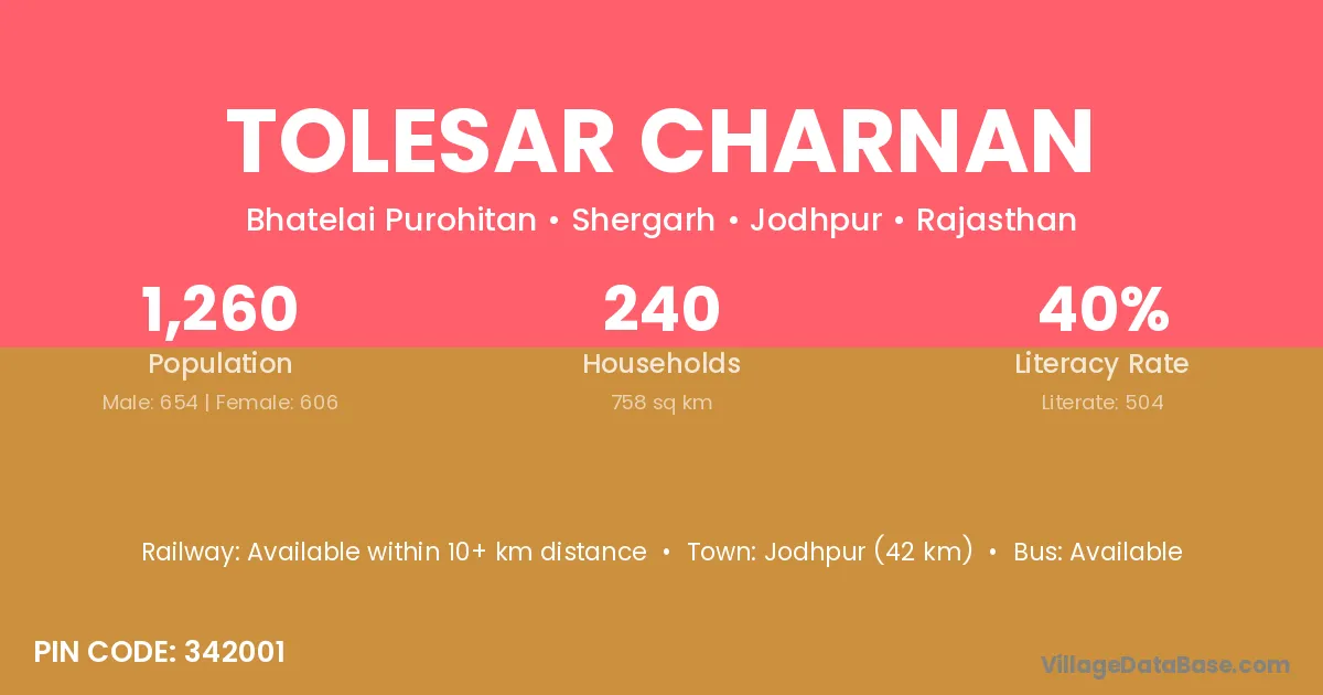 Jodhpur (42 km) is the nearest town to Tolesar Charnan village for major economic activities and is located approximately 42 km away.