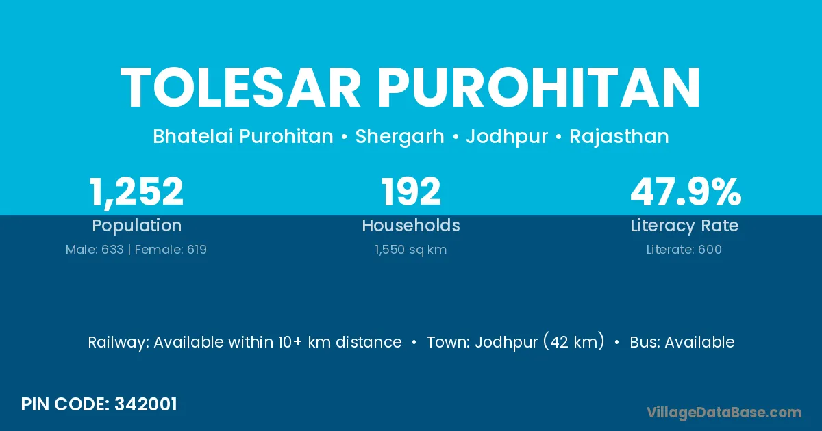 Jodhpur (42 km) is the nearest town to Tolesar Purohitan village for major economic activities and is located approximately 42 km away.