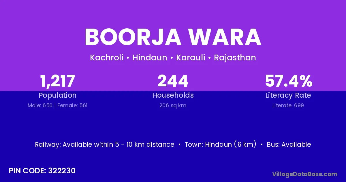 Hindaun (6 km) is the nearest town to Boorja Wara village for major economic activities and is located approximately 6 km away.