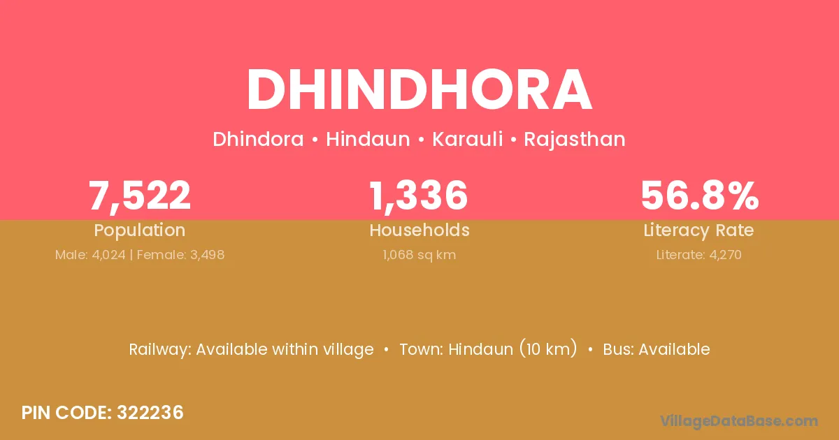 Hindaun (10 km) is the nearest town to Dhindhora village for major economic activities and is located approximately 10 km away.
