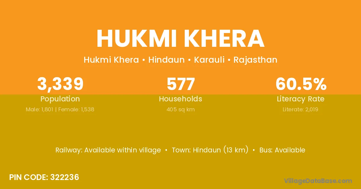 Hindaun (13 km) is the nearest town to Hukmi Khera village for major economic activities and is located approximately 13 km away.