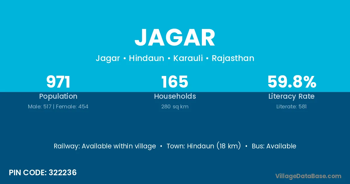 Hindaun (18 km) is the nearest town to Jagar village for major economic activities and is located approximately 18 km away.