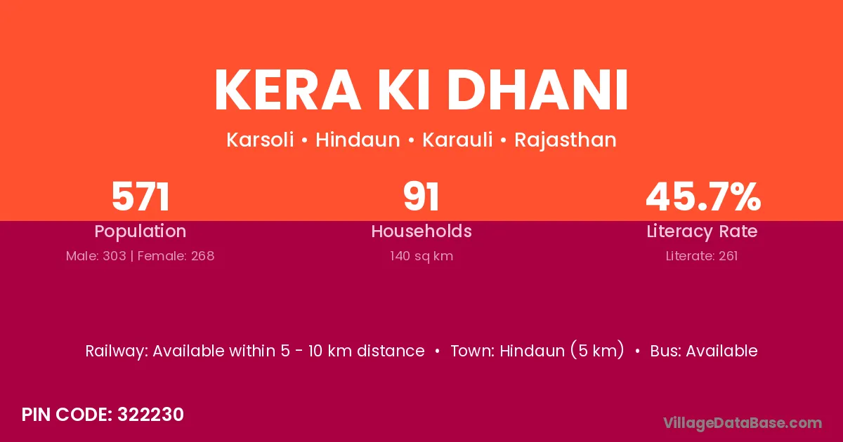 Kera Ki Dhani village has a total population of 571 people, of which 303 are males and 268 are females.