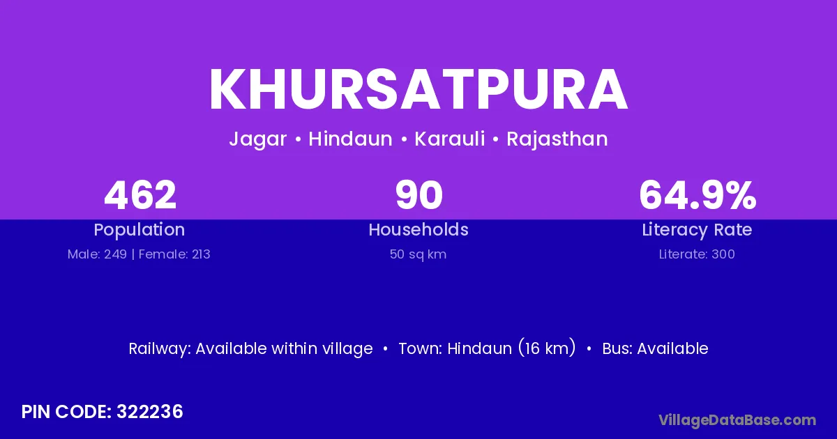Hindaun (16 km) is the nearest town to Khursatpura village for major economic activities and is located approximately 16 km away.