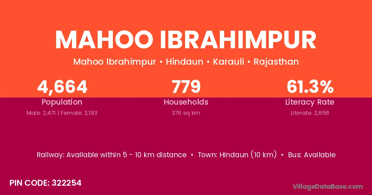 Hindaun (10 km) is the nearest town to Mahoo Ibrahimpur village for major economic activities and is located approximately 10 km away.