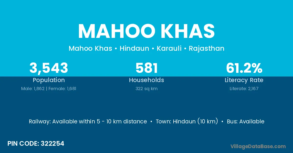 Hindaun (10 km) is the nearest town to Mahoo Khas village for major economic activities and is located approximately 10 km away.