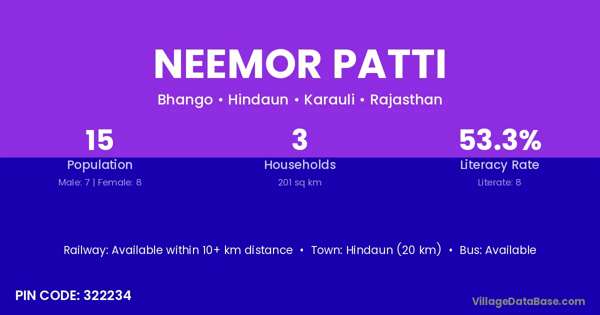 Hindaun (20 km) is the nearest town to Neemor Patti village for major economic activities and is located approximately 20 km away.