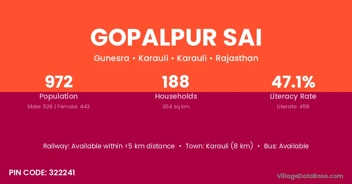 Karauli (8 km) is the nearest town to Gopalpur Sai village for major economic activities and is located approximately 8 km away.