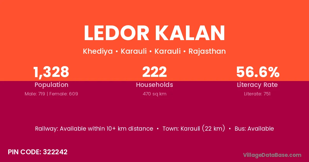 Karauli (22 km) is the nearest town to Ledor Kalan village for major economic activities and is located approximately 22 km away.