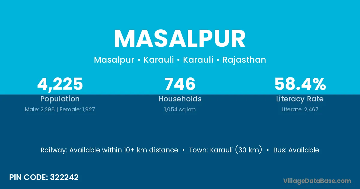 Karauli (30 km) is the nearest town to Masalpur village for major economic activities and is located approximately 30 km away.