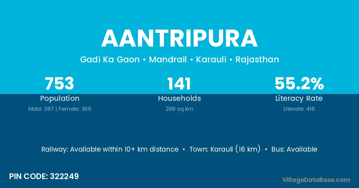Karauli (16 km) is the nearest town to Aantripura village for major economic activities and is located approximately 16 km away.