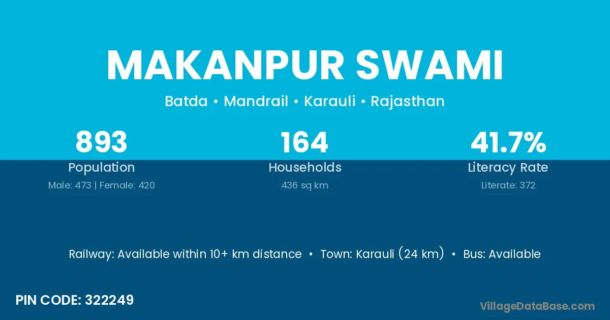 Karauli (24 km) is the nearest town to Makanpur Swami village for major economic activities and is located approximately 24 km away.