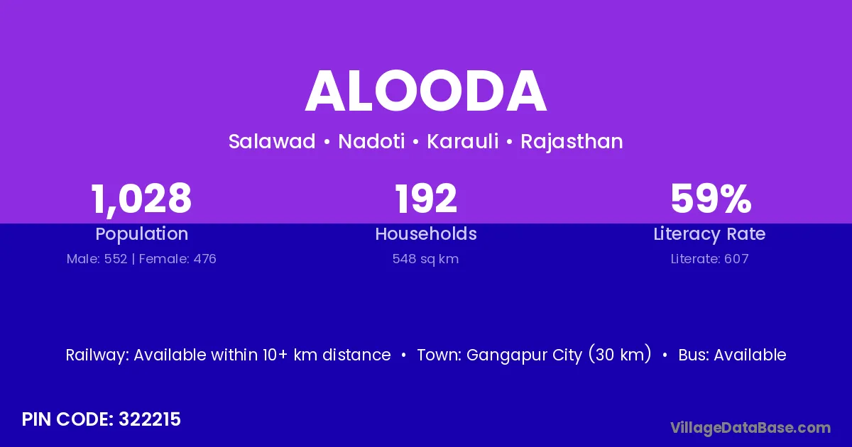 Gangapur City (30 km) is the nearest town to Alooda village for major economic activities and is located approximately 30 km away.