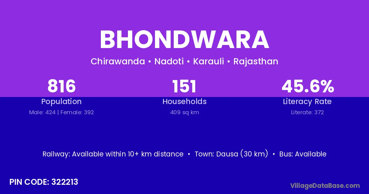 Dausa (30 km) is the nearest town to Bhondwara village for major economic activities and is located approximately 30 km away.