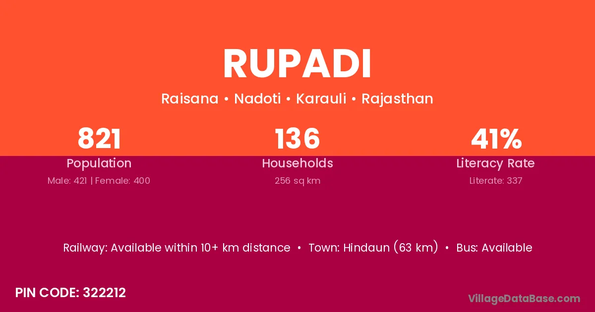 Hindaun (63 km) is the nearest town to Rupadi village for major economic activities and is located approximately 63 km away.
