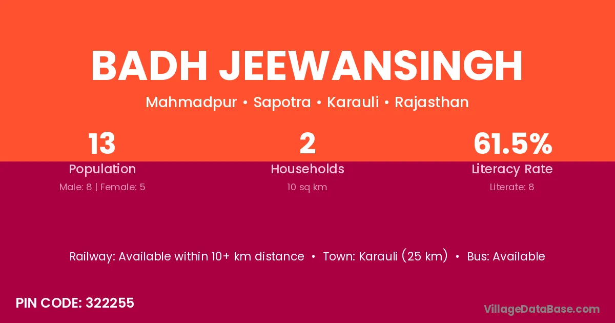 Badh Jeewansingh village has a total population of 13 people, of which 8 are males and 5 are females.