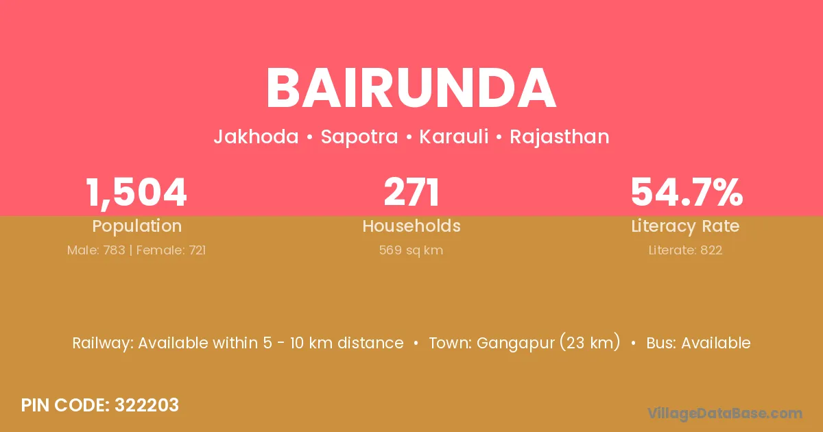 Gangapur (23 km) is the nearest town to Bairunda village for major economic activities and is located approximately 23 km away.