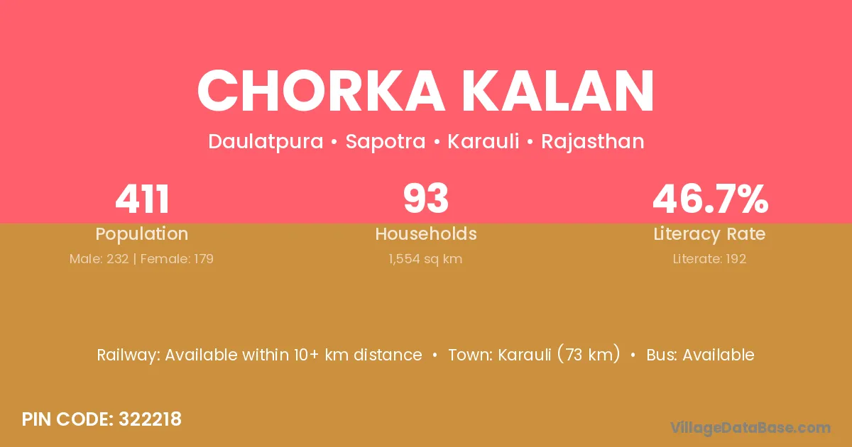 Chorka Kalan village has a total population of 411 people, of which 232 are males and 179 are females.