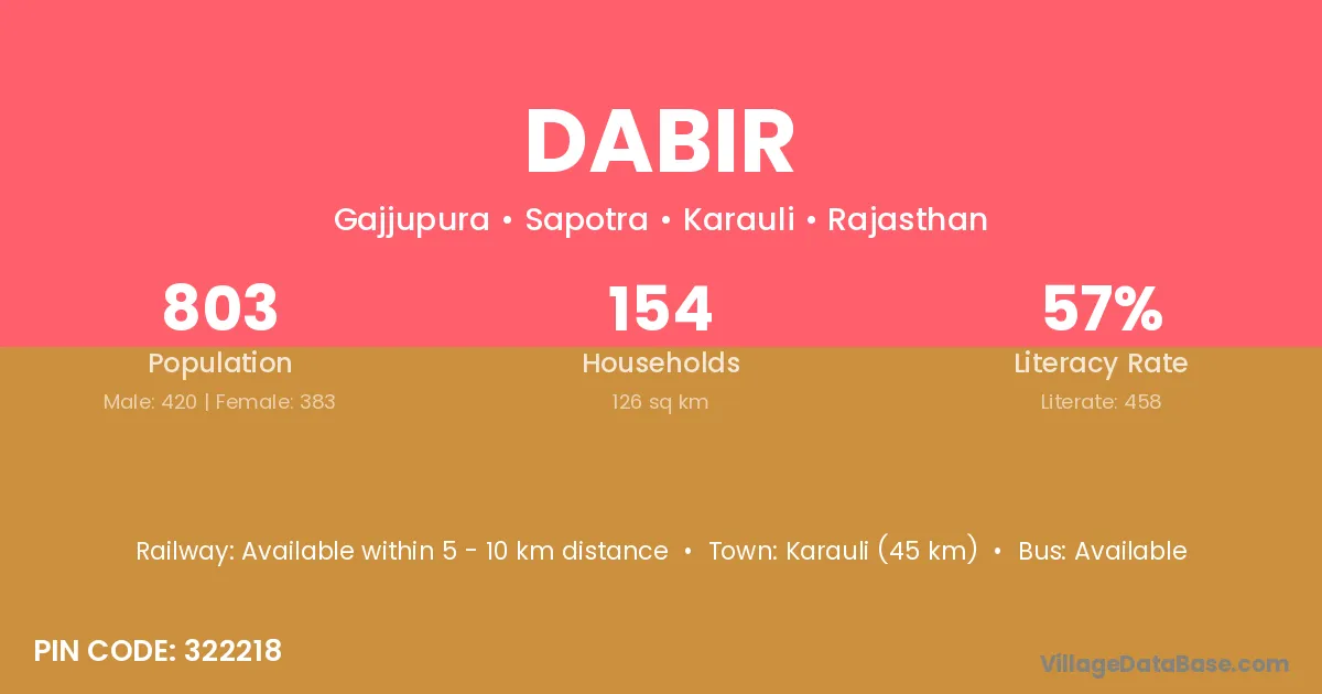 Karauli (45 km) is the nearest town to Dabir village for major economic activities and is located approximately 45 km away.