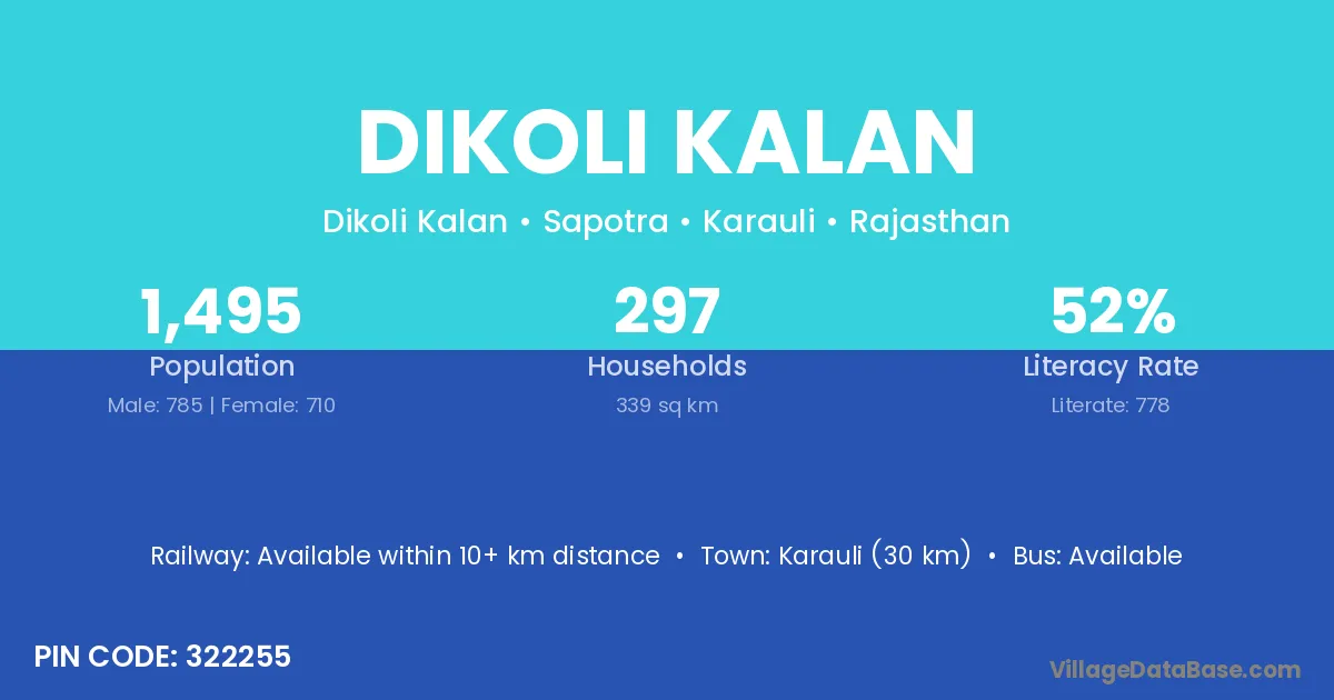 Karauli (30 km) is the nearest town to Dikoli Kalan village for major economic activities and is located approximately 30 km away.
