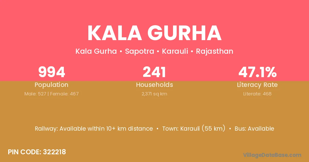 Karauli (55 km) is the nearest town to Kala Gurha village for major economic activities and is located approximately 55 km away.