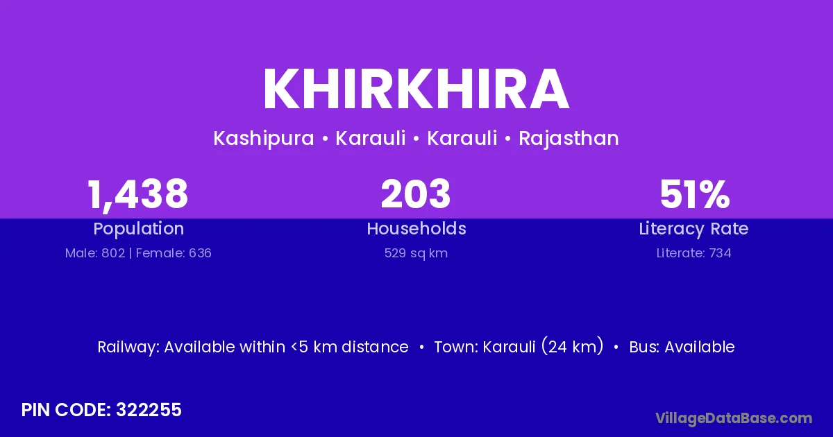 According to Census 2011 information, the village code of Khirkhira village is 322202.