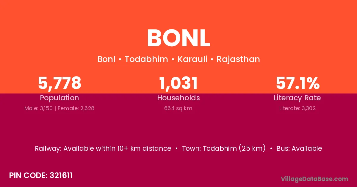 Todabhim (25 km) is the nearest town to Bonl village for major economic activities and is located approximately 25 km away.