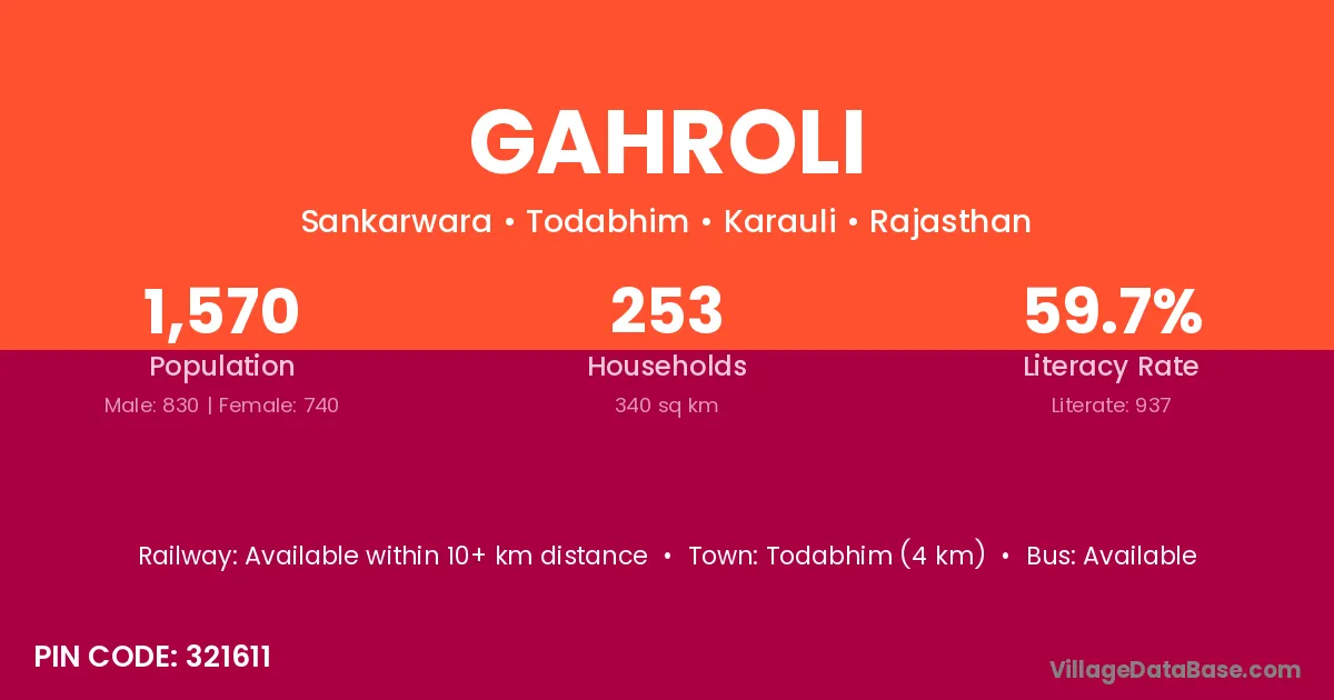 Todabhim (4 km) is the nearest town to Gahroli village for major economic activities and is located approximately 4 km away.