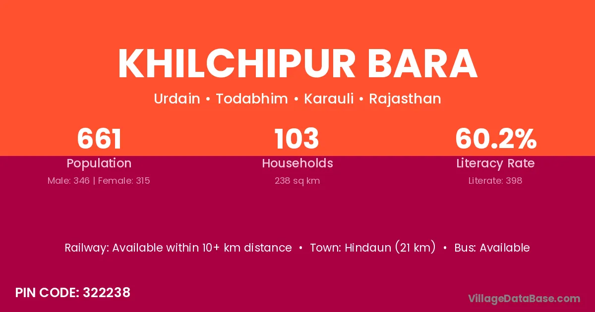 Hindaun (21 km) is the nearest town to Khilchipur Bara village for major economic activities and is located approximately 21 km away.