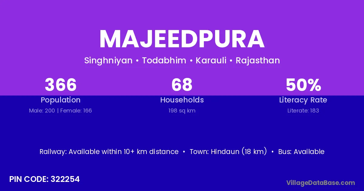 Hindaun (18 km) is the nearest town to Majeedpura village for major economic activities and is located approximately 18 km away.