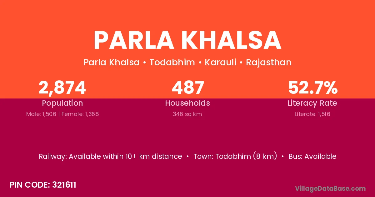 Todabhim (8 km) is the nearest town to Parla Khalsa village for major economic activities and is located approximately 8 km away.
