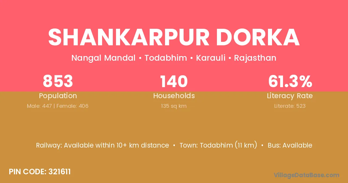 Todabhim (11 km) is the nearest town to Shankarpur Dorka village for major economic activities and is located approximately 11 km away.