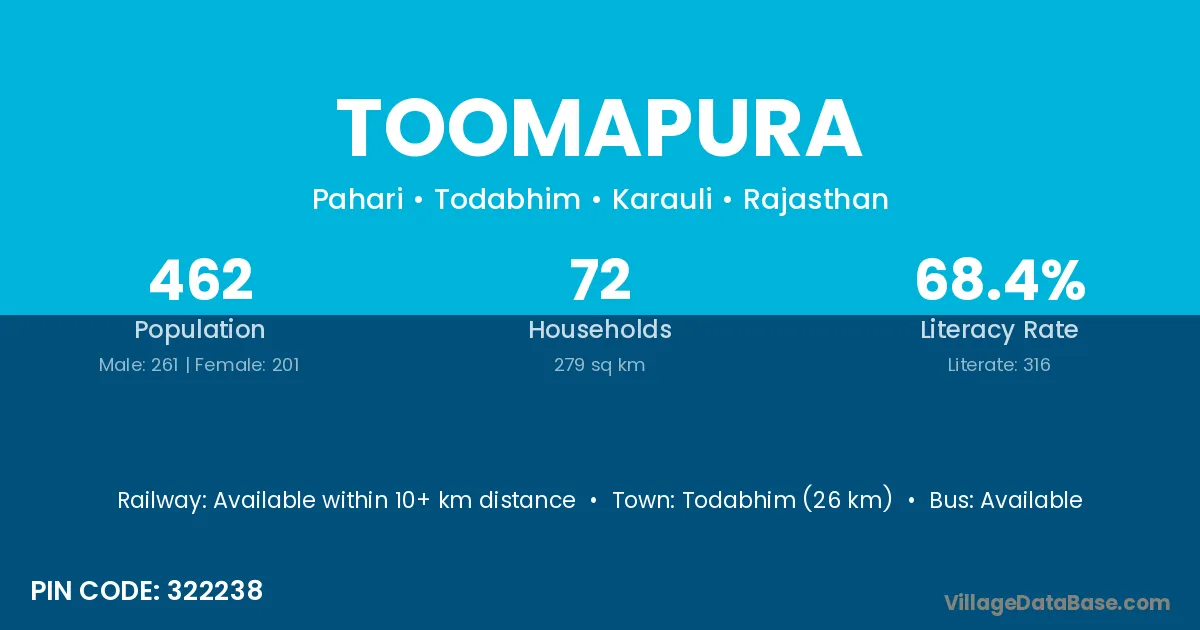 Todabhim (26 km) is the nearest town to Toomapura village for major economic activities and is located approximately 26 km away.