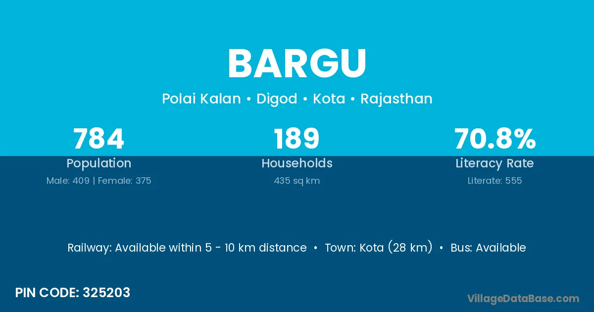 Kota (28 km) is the nearest town to Bargu village for major economic activities and is located approximately 28 km away.