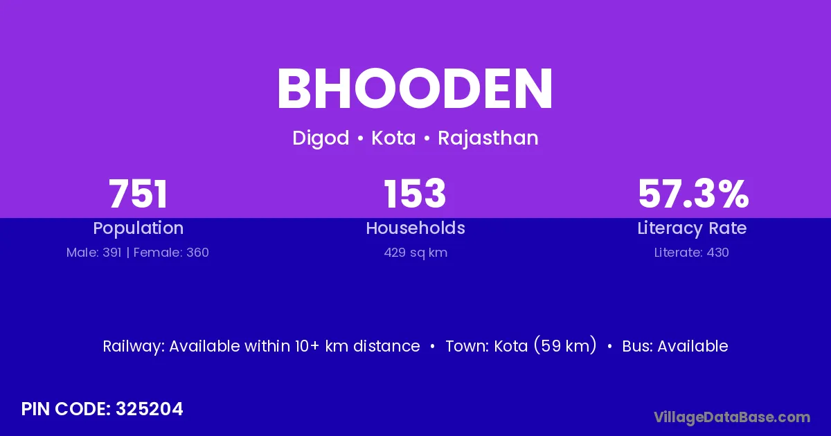 Kota (59 km) is the nearest town to Bhooden village for major economic activities and is located approximately 59 km away.