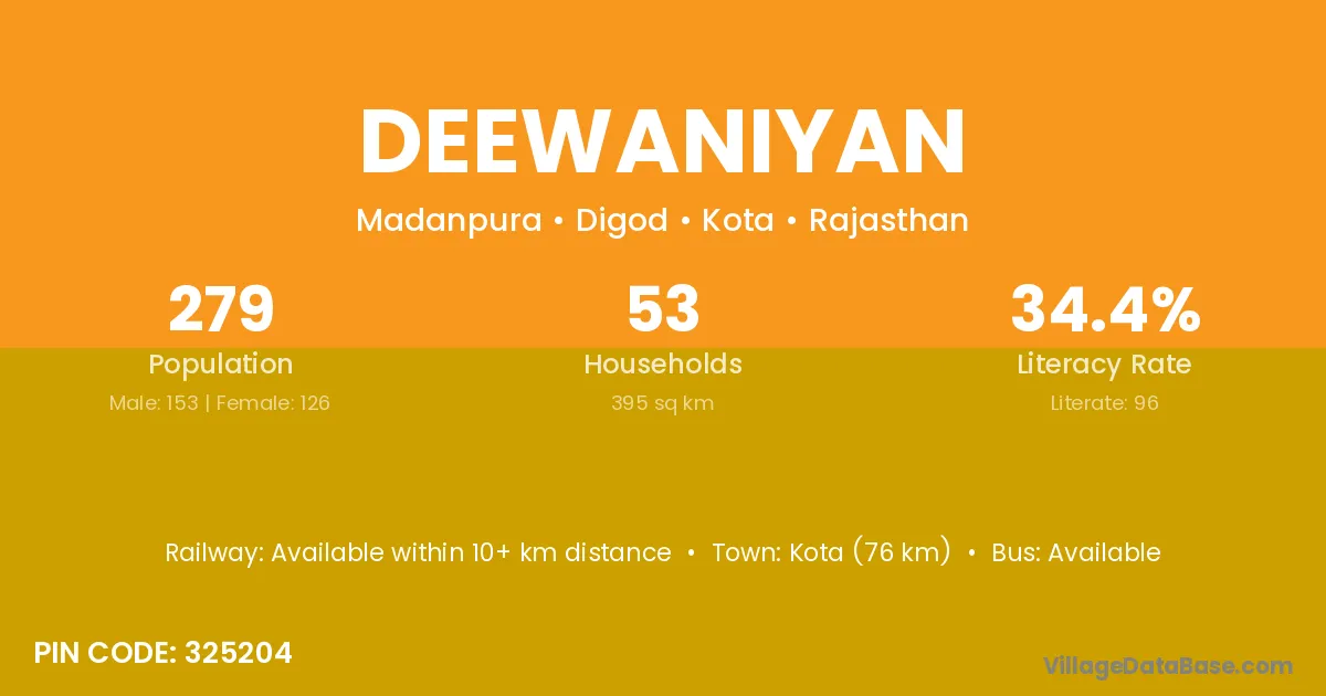 Kota (76 km) is the nearest town to Deewaniyan village for major economic activities and is located approximately 76 km away.