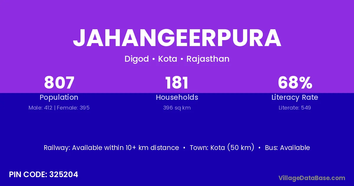 Kota (50 km) is the nearest town to Jahangeerpura village for major economic activities and is located approximately 50 km away.