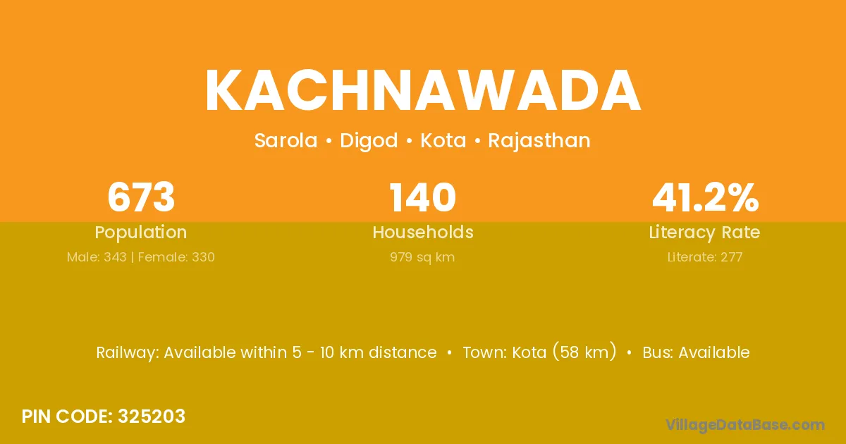 Kachnawada village has a total population of 673 people, of which 343 are males and 330 are females.